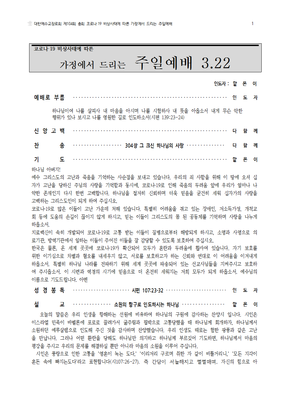 3월 22일 가정예배 지침서