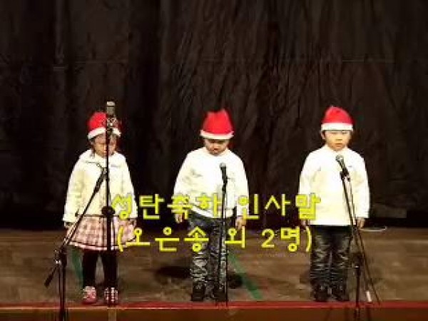 2012.12.24 성탄축하행사 성탄 전야 행사 1. 유치부 인사말 2. 유치부 율동(딩동딩동외 1곡) 3. 여전도회 성극(예수님의 족보) 4. 아동부 율동(기쁘다 구주오셨네) 5. 청년회 꽁트(멘붕교회) 6. 중고등부 노래(다행이다, 야…